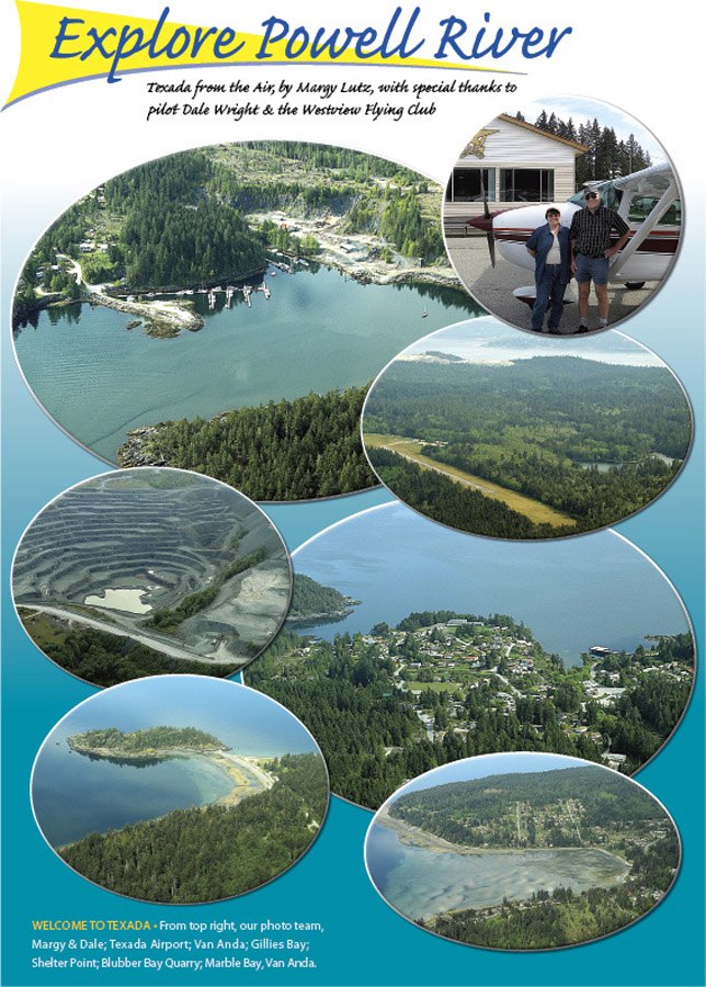 There’s a lot happening on Texada this month. Van Anda Days on July 12, the Fly–In on July 13, Sandcastle Days in August. Grieco has written passionately about Van Anda’s history and has produced a wonderful profile on one of the island’s many characters, canoeist/kayaker Diana Vaughn. Besides being an intrepid outdoors woman, Vaughn also happens to be the mother of Kim Miller, manager of the Powell River Chamber of Commerce!
